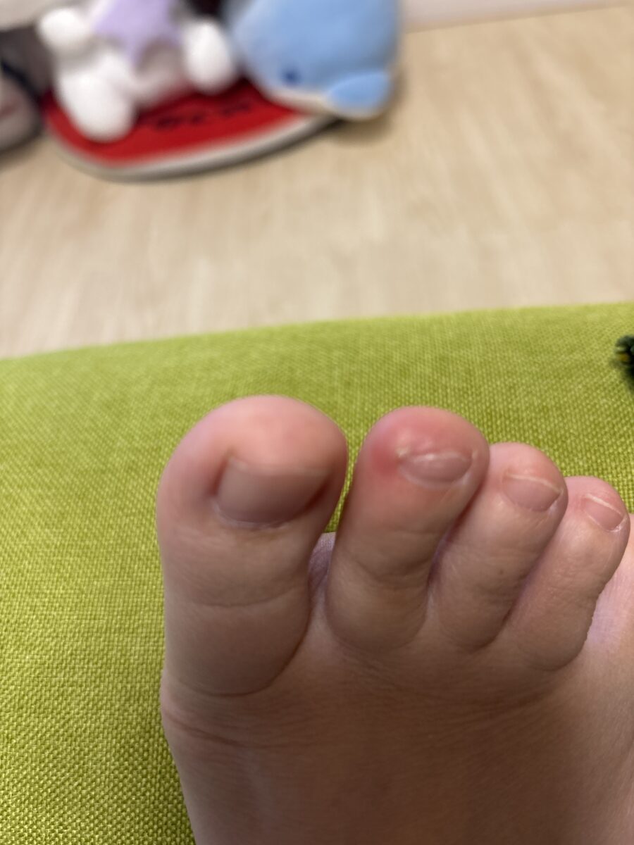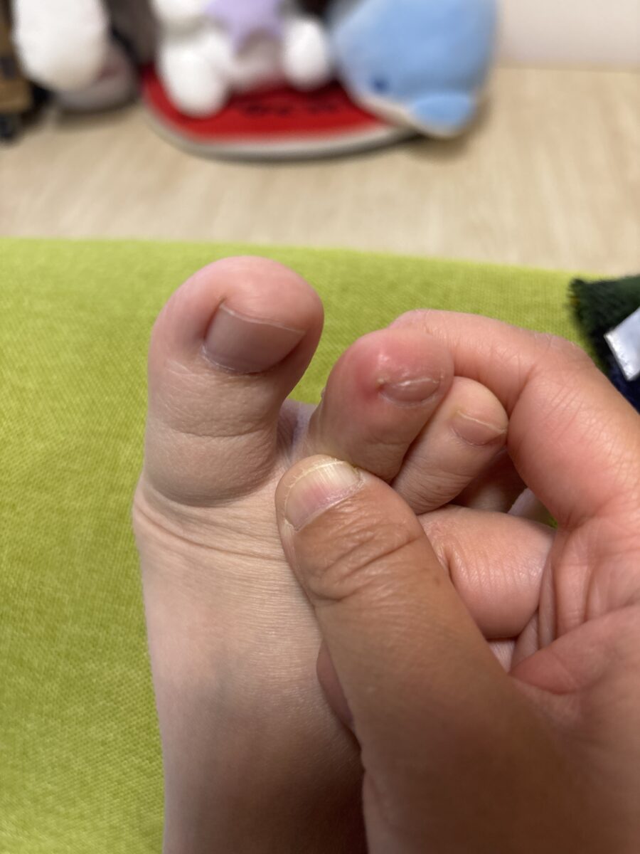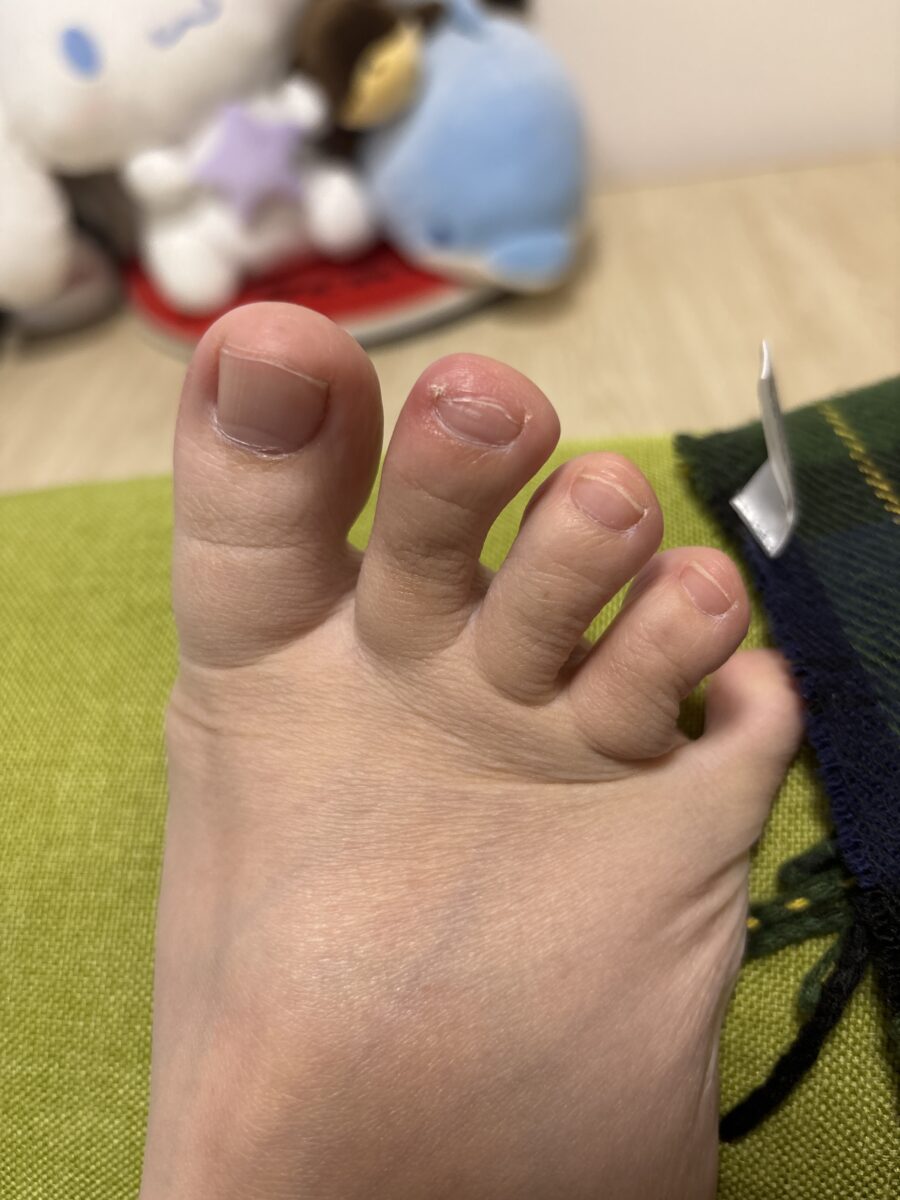 右足の人差し指の爪の脇(右)の方が赤くなり痛みがあります