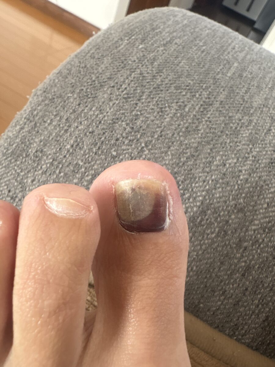 今は痛みはありませんが、爪の先端が反って上を向き始める場所は良く内出血が起こって黒い筋が多数出来ます。